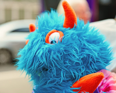 As usually, Mr. Guy was carrying me when we walked into the hotel. Several people called out, "Look! It's Blueper B!" I wasn't sure who any of these people were or how they knew me. Mr. Guy said that he bet that they read my blog and that's how they knew who I was. I felt kind of like a monster star. I got to talk to people, shake hands with them, and have my picture taken with them! The first one is with Joni. She and The Lady are good friends. They have lots of things in common like this thing they do where they tie string together with two sticks. Somehow they make the string turn into objects like hats and socks. They call it knitting. I think it's some kind of magic trick. Maybe they could knit me a magic T-shirt.